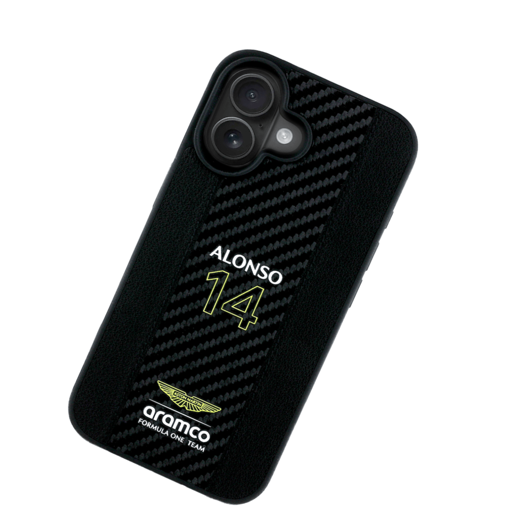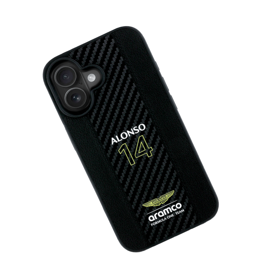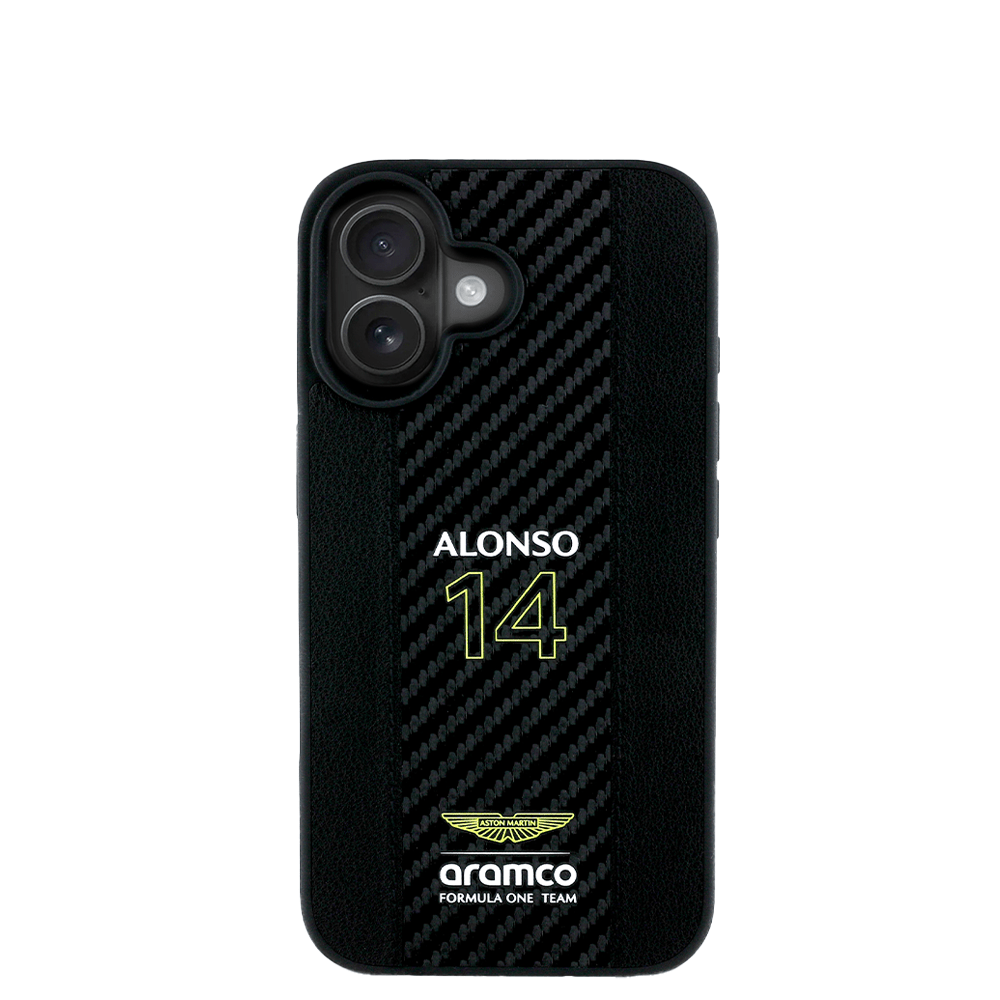 Celebrate the legacy of Formula 1 legend Fernando Alonso with the Aston Martin Aramco F1 Genuine Black Leather Case for iPhone 16. Crafted from premium genuine leather, this case features a carbon stripe accent and the iconic Aston Martin Aramco F1 logo, embodying the spirit of high-performance racing. Engineered for seamless MagSafe compatibility, it ensures effortless wireless charging. As an officially licensed Aston Martin product, Fastrak is authorized to bring you this exclusive accessory that combines luxury design with everyday functionality.