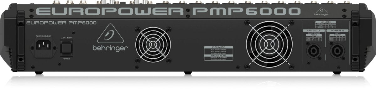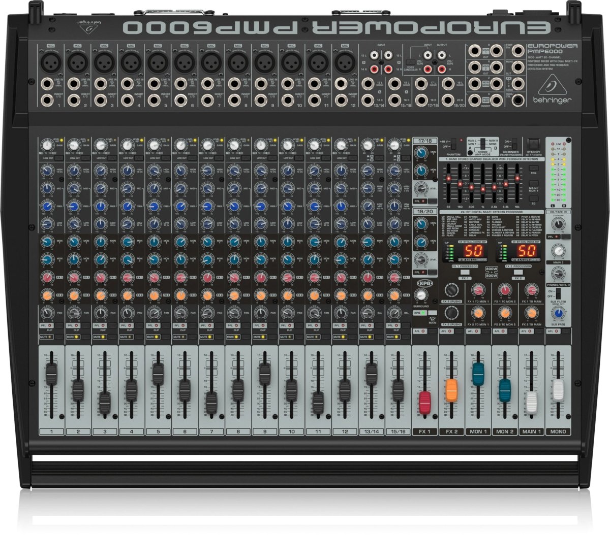 The amazing PMP6000 Powered Mixer packs tremendous power (2 x 800 Watts stereo or 1,600 Watts in Bridged mode) while maintaining an incredible power-to-weight ratio. These mixers employ high-efficiency Class-D technology and a state-of-the-art switch-mode power supply, which significantly reduces weight and heat. The 20-channel PMP6000 features 12 built-in, studio-grade XENYX mic preamps, 4 stereo channels, dual 24-bit Multi-FX processors with 100 awesome presets including studio-class reverbs, delays, pitch shifter, and various multi-effects, plus a 7-band stereo graphic EQ with Behringer's proprietary FBQ Feedback Detection System – for the ultimate in feedback-free performance.