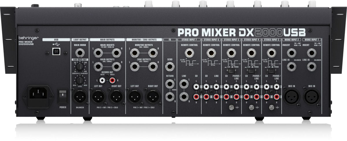 For the DJ in need of mammoth bass, the DX2000USB features an XLR Sub Bass Out (perfect for connecting to an active subwoofer) with an adjustable Crossover Frequency (30 - 200 Hz) and dedicated Level control. Directly above, the DX2000USB provides a ¼" Main Mono ouput for synching your music’s strongest pulses with a lighting system. The Main Output section offers ¼" and XLR stereo outputs, as well as ¼" inputs for connection to outboard EQ units. This section also features RCA outputs for recording your set. The Monitor/Zone Output section gives you stereo ¼" and XLR Monitor Outputs, as well as ¼" stereo Zone Outputs.