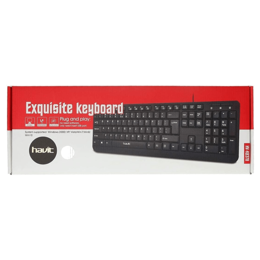 Enhance your typing experience with the Havit HV-KB378 USB Exquisite Wired Keyboard. Featuring a full-sized 104-key layout, durable construction, and ergonomic design, this keyboard is perfect for both home and office use.