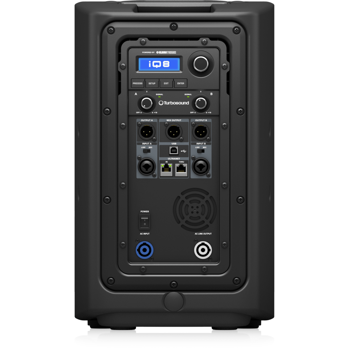 The iQ8 also features our proprietary ULTRANET technology, which allows the use of CAT5 cables for transmitting pristine multi-channel audio signals and other information between ULTRANET-enabled products, such as digital mixers and personal monitor systems. This digital distribution networking not only eliminates the potential for RFI and crosstalk so common to analogue methods, but also significantly reduces the setup or installation time required. An onboard USB port provides access for remote control of the iQ8 via PC computer, as well as DSP and speaker modelling firmware updates.