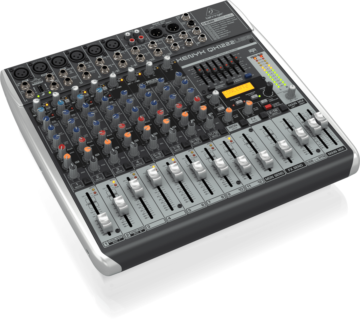 The QX1222USB comes equipped with channel Inserts for inputs 1 – 4 for use with outboard FX, a stereo 7-band graphic EQ, which can be assigned to the main or monitor buses, and our proprietary FBQ Feedback Detection System. Other features include full-sized faders for MON and FX Sends, our XPQ 3D stereo surround effect (creates a broader, enhanced stereo image), and a handy Voice Canceller function for removing vocals from pre-recorded media for “instant-karaoke” applications.