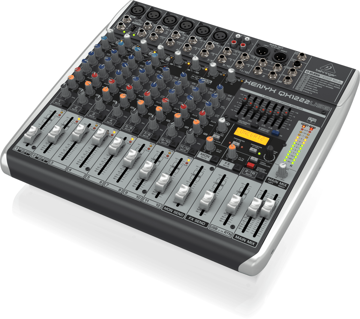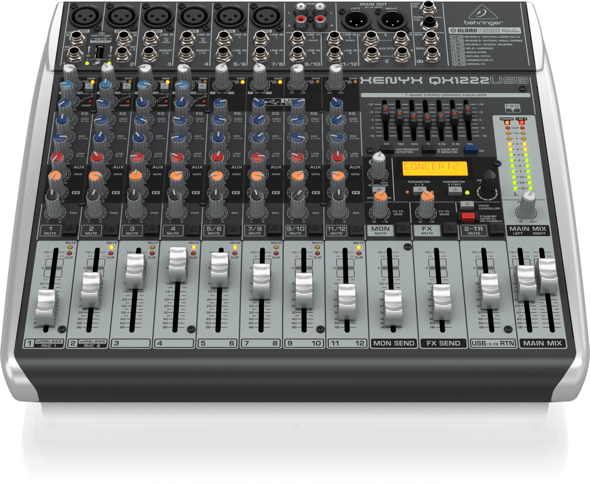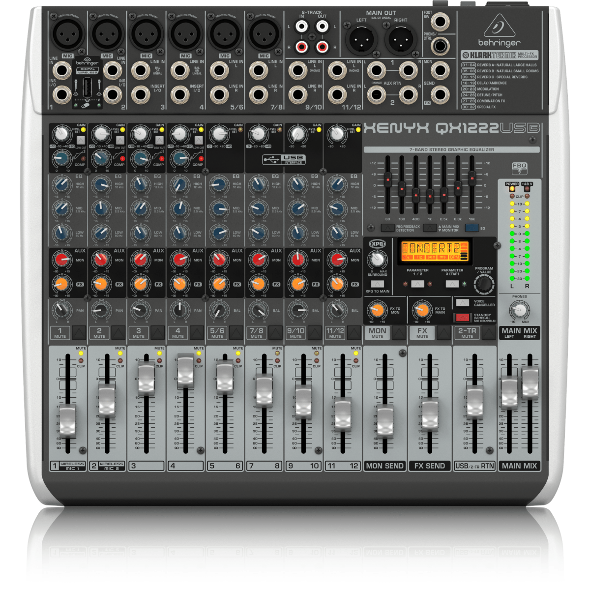 The compact XENYX QX1222USB mixer allows you to effortlessly achieve premium-quality sound. Channels 1 - 4 feature our XENYX Mic Preamps, renowned for their pristine performance, plus 2 of the 4 stereo channels accept XLR inputs, as well as Line-Level sources. All mono channels get our ultra-musical “British” 3-band EQs and easy-to-use “one-knob” compressors for the ultimate in punch and clarity. Add to this our KLARK TEKNIK FX processor with 32 studio-grade presets with dual addressable parameters, Tap function, and storable user parameter settings – and the QX1222USB.
