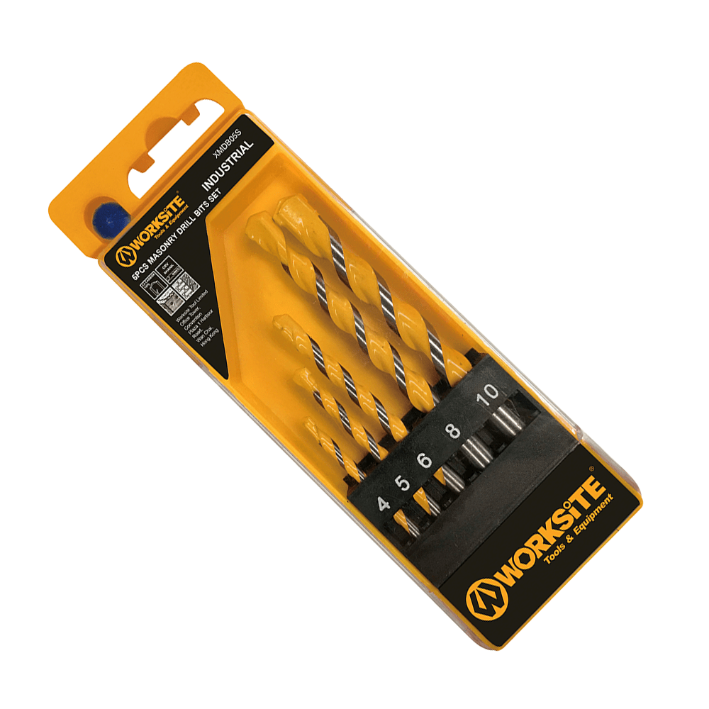 The WorkSite 5-Piece Masonry Drill Bits Set XMDB05S is designed for drilling into concrete, brick, stone and other hard surfaces. Each bit is crafted from durable, high-grade steel with a reinforced carbide tip for long-lasting sharpness and precision. The set includes a range of commonly used sizes, ensuring you always have the right bit for installations, mounting, home repairs and construction work. Their spiral fluting allows efficient debris removal, enabling cleaner, more controlled drilling.